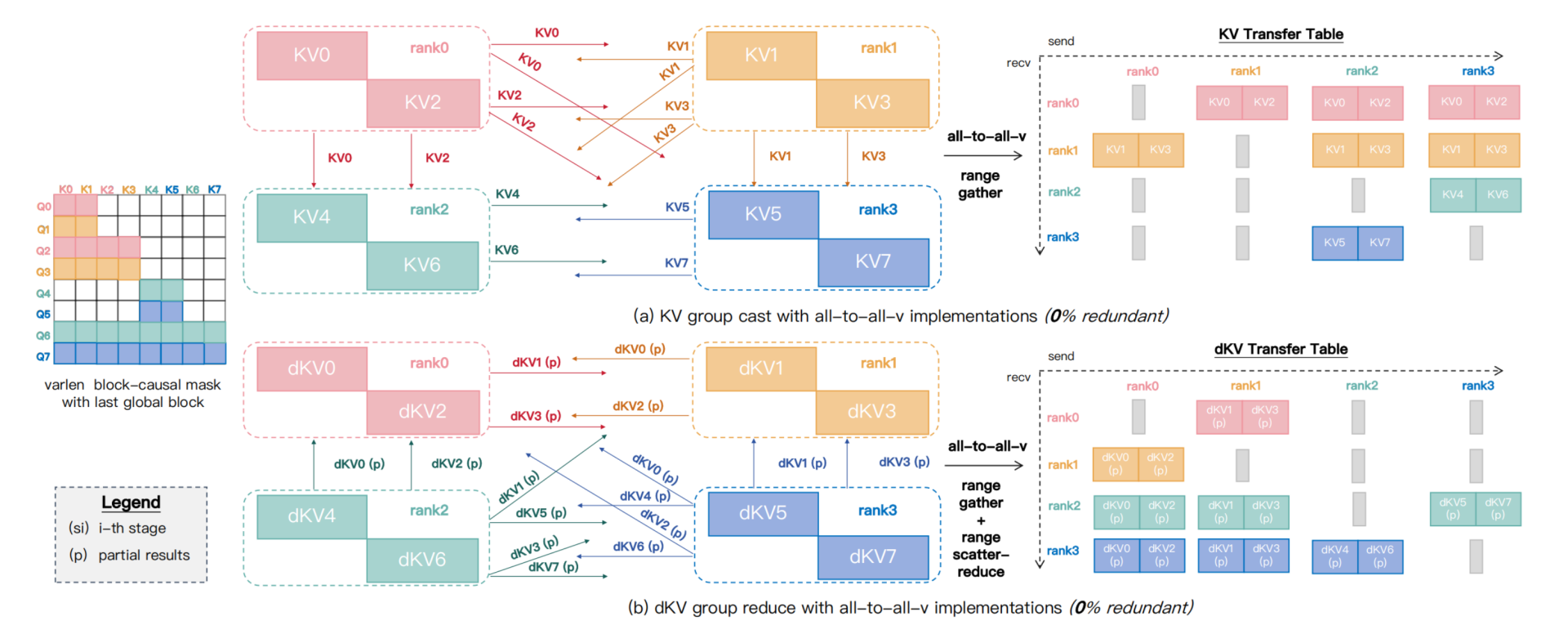 为了解决这个问题,sandai基于nccl的all2allv设计了Group-Cast和Group-Reduce语义,还是对于上图causal mask的场景,只有Q6和Q7才需要rank2的KV5,因此rank2的KV5只需要通过Group-Cast广播到rank0和rank1。