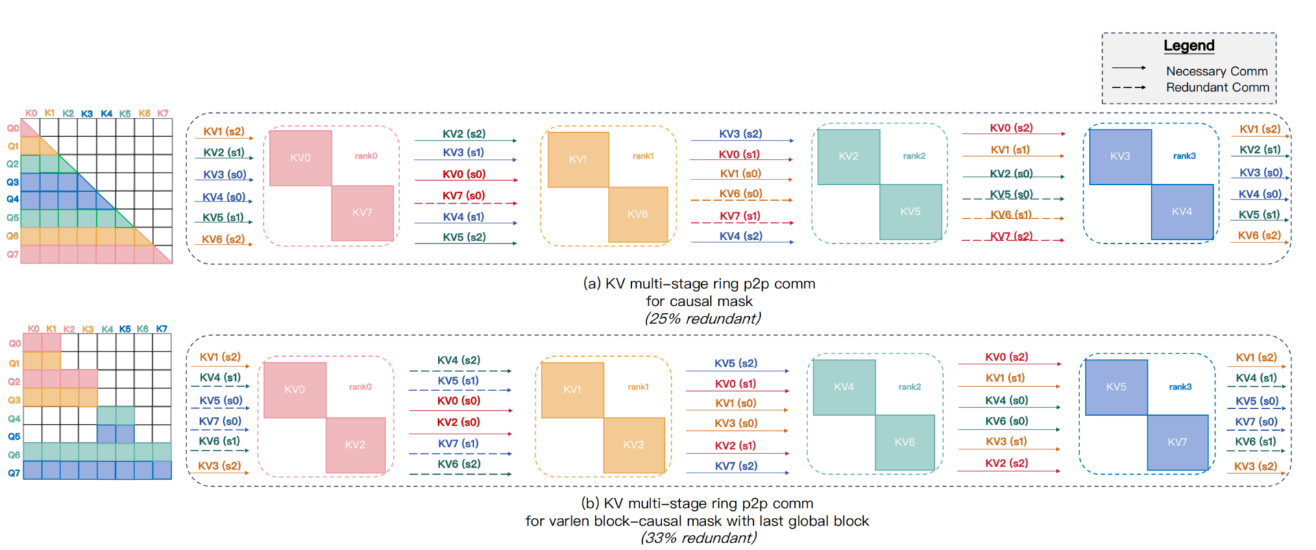 现有方案都是基于ring-attention,使用p2p原语进行通信,这会导致冗余通信,以causal mask为例会导致25%的冗余通信,如下图a所示,KV0被所有rank需要,因此他需要被广播到所有rank,反向时dKV0需要执行allreduce。但是对于KV7,是不需要任何通信的,但是在ring-attention中,还是被环形通信了一圈。进一步的,对于不规则的mask,会进一步加剧,如下图B,会导致33%的冗余通信。