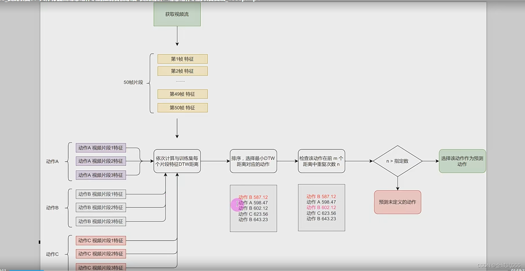 大致: 1、各动作片段视频,提取特征 -> 2、大视频、视频流、提取特征 -> 3、计算视频流中,各动作的 dtw距离 -> 4、由小到大排序 -> 5、最满足筛选条件的,认定为《某动作》!!