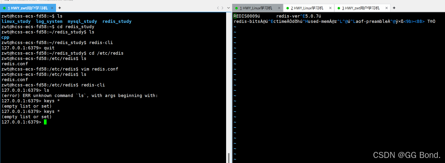 我们同时打开多个终端,一个打开redis进行操作,另一个可以查看dump.rdb文件观察数据的持久化情况