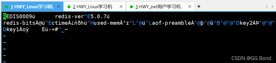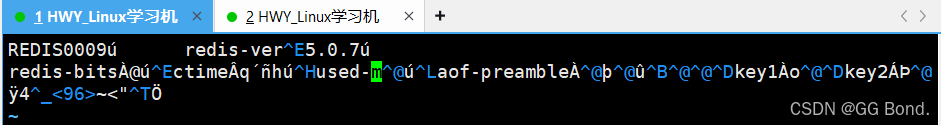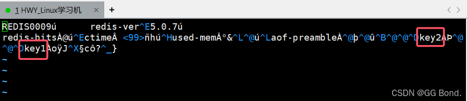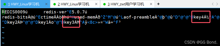 如图我们又添加了两个新的值key3和key4,然后我们使用bgsave手动触发RDB机制,然后此时查看我们的RDB文件,通过一些关键字我们就可以看到我们的值已经被备份到RDB文件中了,此时如果我们重启了redis服务器,RDB文件就会被加载恢复内存之前的状态