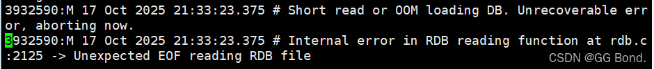 我们的RDB文件的修改是在最近一次操作的,所以直接查看最后一条日志就是了,这条日志就告诉我们在 rdb 数据恢复中出现了错误