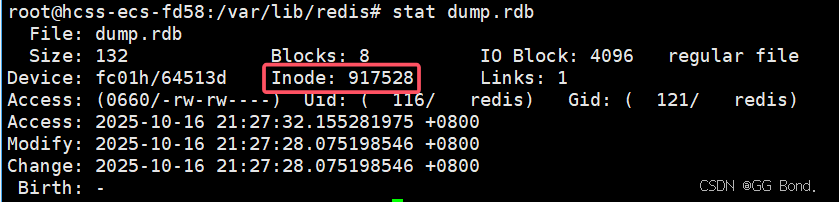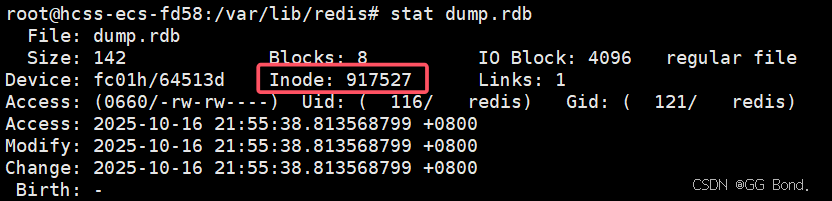我们可以发现RDB文件的inode发生了变化,也就是说这个RDB文件并不是原来的RDB文件了,这就侧面说明我们的bgsave正确完成了备份工作**(临时文件+重命名机制)**