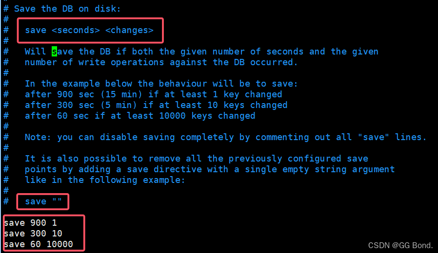 里面有这几项内容,最上面的注释语句就是告诉我们 save 配置的规则是:save m n,意思是在m秒内修改n次就会自动触发RDB,最下面的三条就是我们的默认的 save 配置,save " " 的意思是不启用 save 配置(关闭自动生成快照)