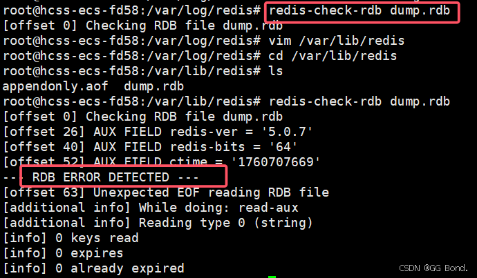 注意要在RDB文件的工作目录下执行这个检测语句才行,执行后我们也可以看到我们的 RDB 文件是有错误的