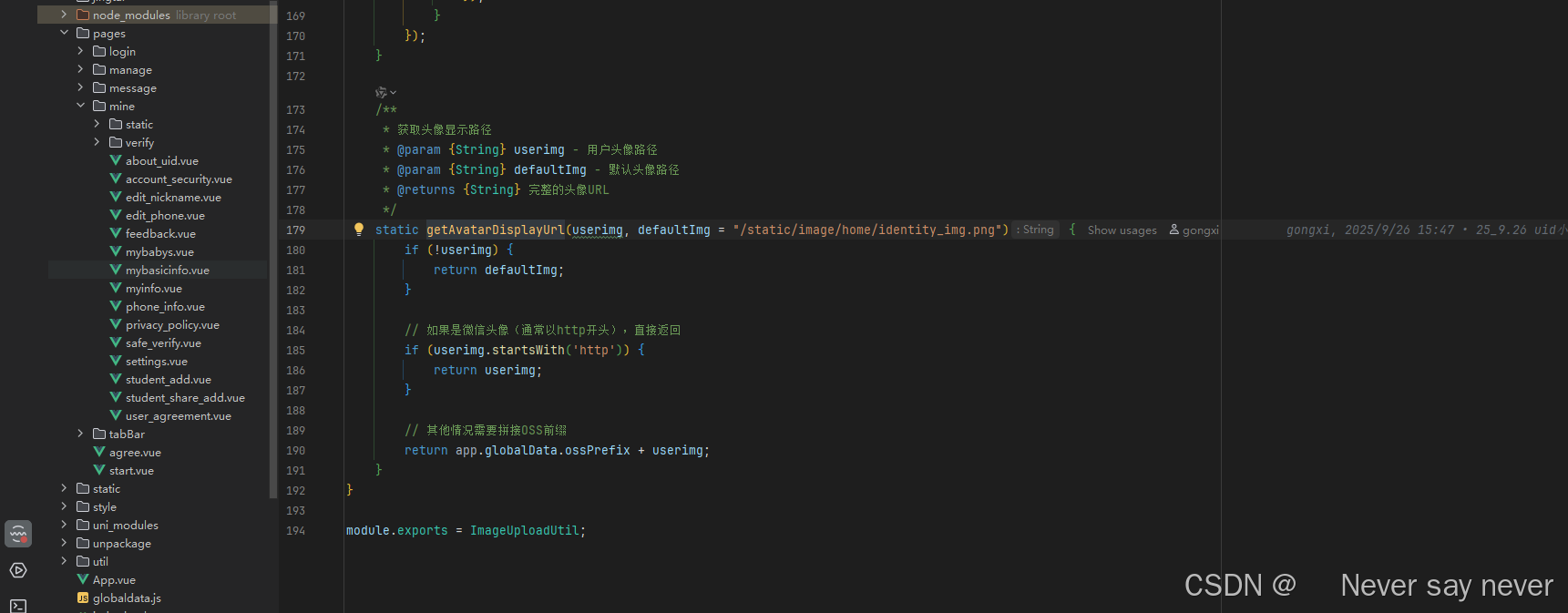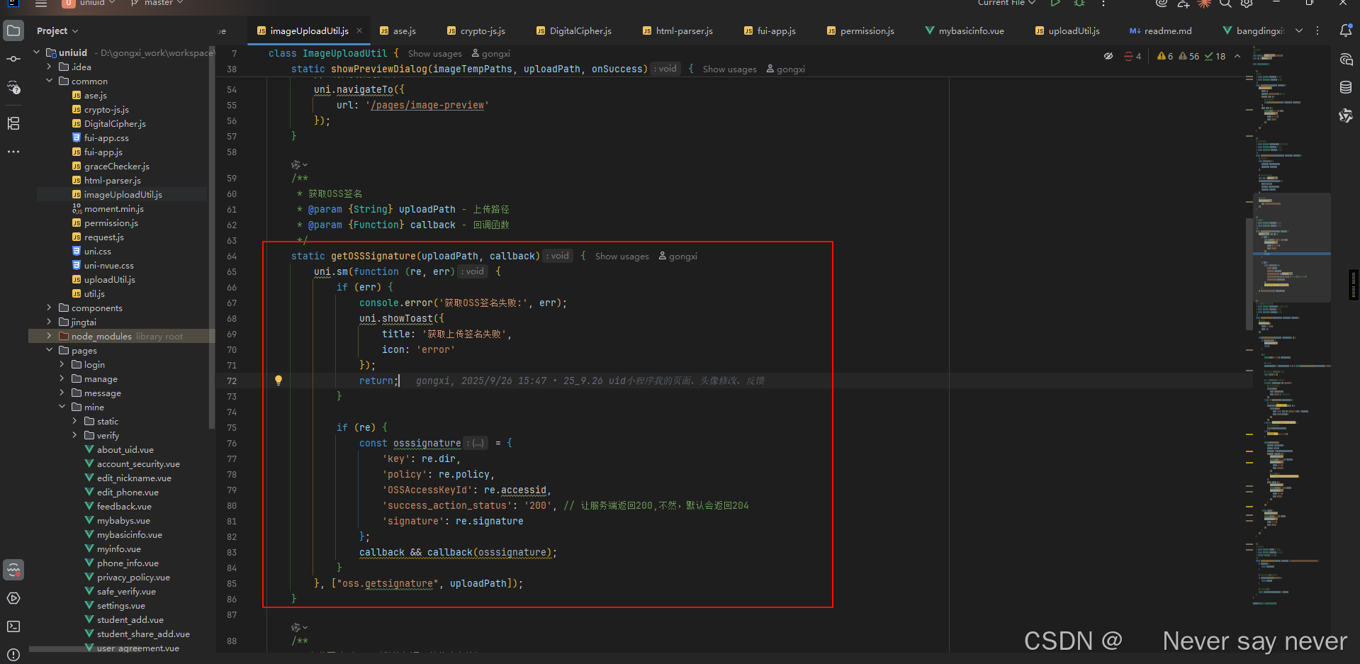 对于头像,图片,视频之类的上传,一般也会封装成一个工具类,在工具类中请求后端的接口去获取相应的OSS临时签名,然后通过这个签名将图像等上传到自己的企业的OSS对象存储服务