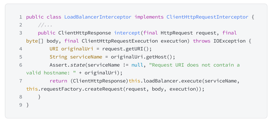 LoadBalancer 的实现,主要是 LoadBalancerInterceptor,这个类会对 RestTemplate 的请求进行拦截,然后从 Eureka 根据服务 id 获取服务列表,然后利用均衡算法,得到真实的服务地址信息,替换服务 id。