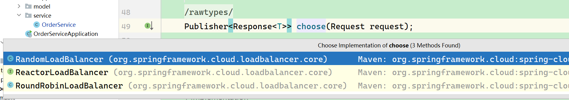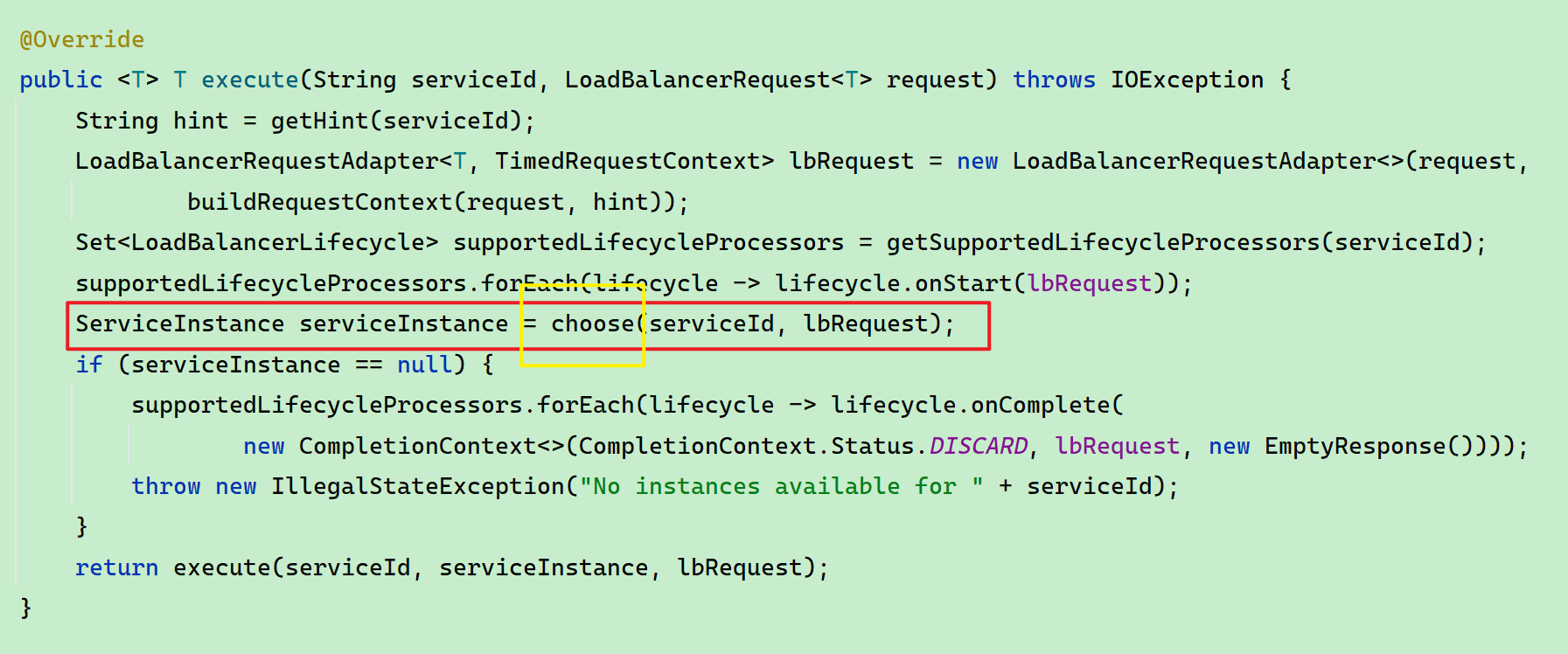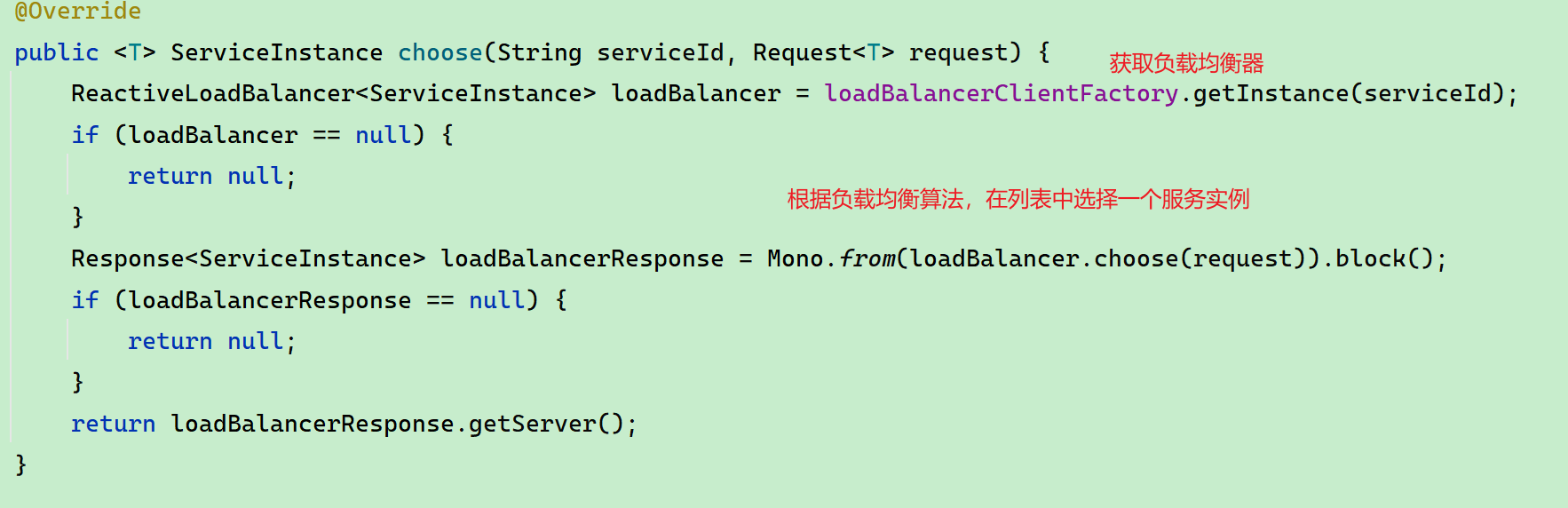 在 choose 中,先获取负载均衡器,然后根据算法,选择一个服务实例