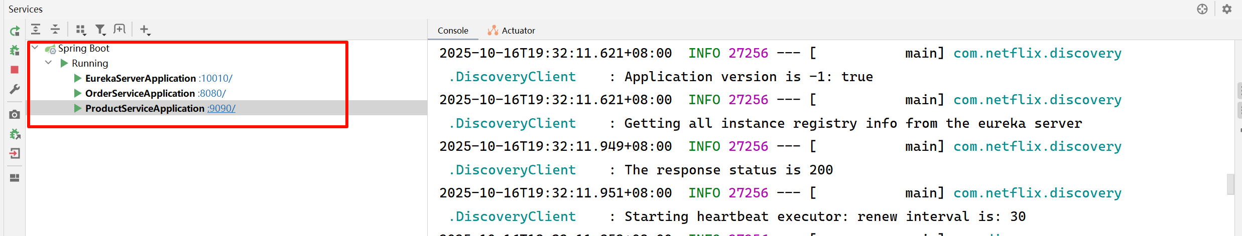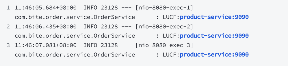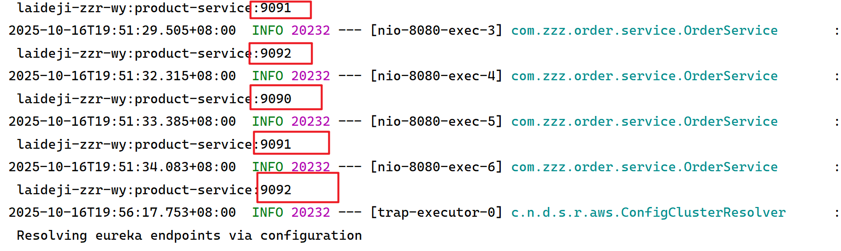 重启 order-service,通过日志可以观察,请求被均衡的分配在了不同的实例上,这就是负载均衡。