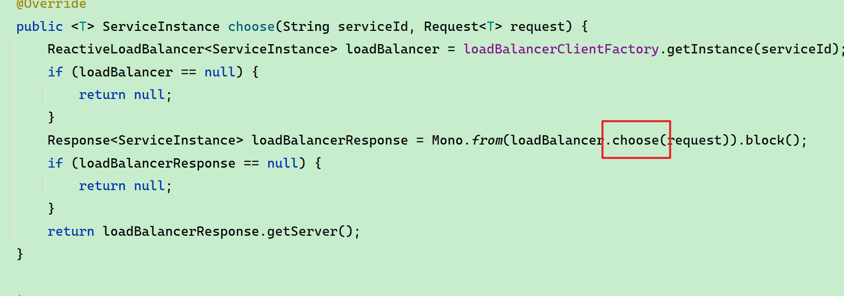 在 choose 方法中,根据 serviceId 和负载均衡策略,选择处理的服务。