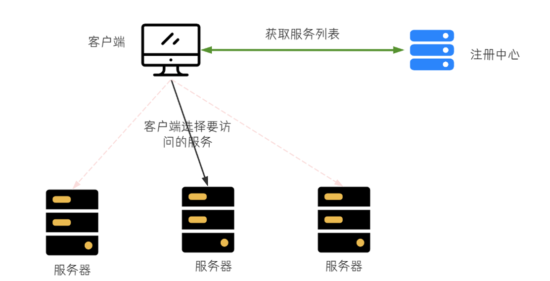 比如 Spring Cloud 的 Ribbon,请求发送到客户端,客户端从注册中心获取服务列表,在发送请求前,通过负载均衡算法选择一个服务器,然后进行访问。