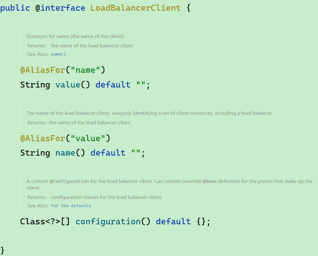 看一下 @LoadBalancerClient 注解的属性:name / value 和 configuration