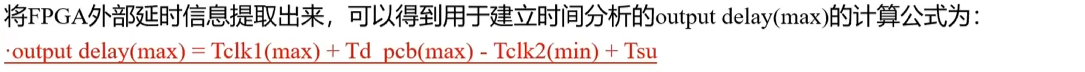 - 公式求IO延迟中,求的是外部数据走向相对于时钟的偏差(数据和时钟的关系),因此以原数据路径到FPGA端口或者端口到外部设备的相对于时钟的延迟来计算,即外部原延迟减去时钟之间的偏差。即,数据延迟多少个外部相对时间到达目标设备的外部接口(不包括设备内部延迟)
