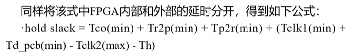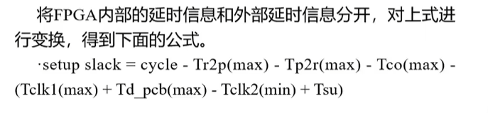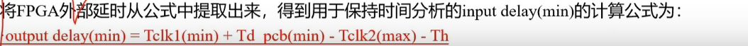 - input_delay和output_delay min和max,均是对外部走线源和目的相对延迟 来说(延迟分两个,内部延迟和外部延迟,input的外部是指源到FPGA端口的一段,out的外部是FPGA端口到外部设备端口这一段)。在分析时均以如何试探建立时间和保持时间的极限值来进行计算,以这个思路就好分析公式的用意。总体来说,求的是源到目的到达时间的相对值。