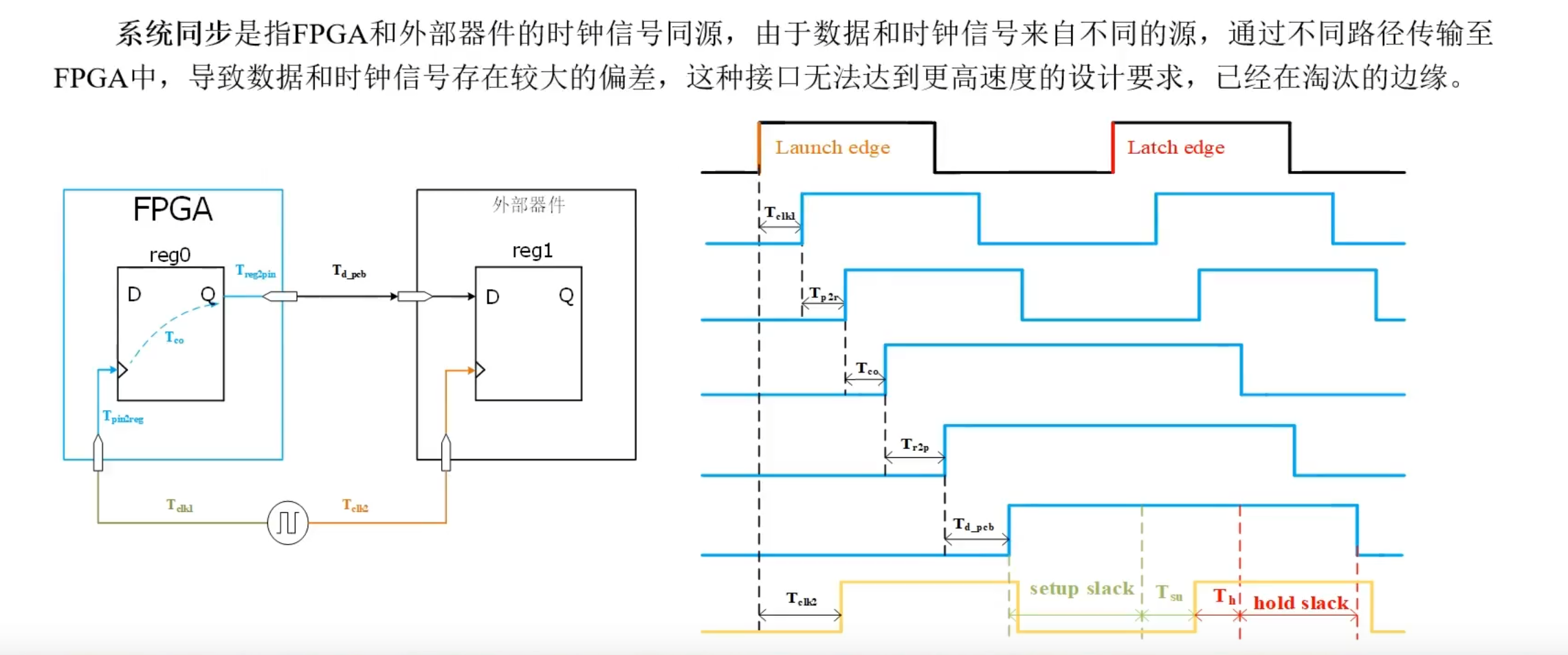 系统同步接口 指的是FPGA 与外部器件共享同源时钟信号的通信方式。即: