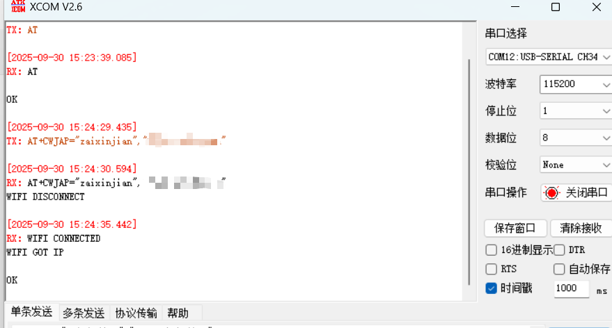 AT+CWMODE=1:设置为Station模式(作为WiFi客户端)