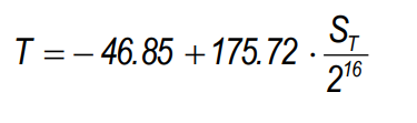 无论选择哪种分辨率,温度 T 都是通过将温度信号输出 ST 代入以下公式(结果以 °C 为单位)计算得出的: