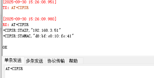 # AT+CIFSR # 查看本模块的 IP 地址,AP 模式下无效!会造成死机现象!