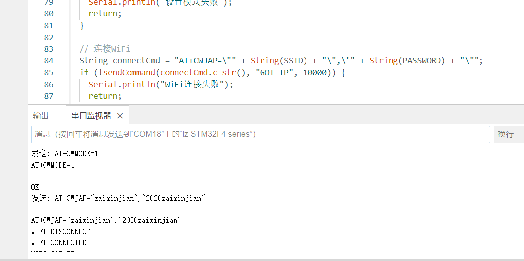 AT+CWMODE=1 # 指令原型为:AT+CWMODE=<mode>;其中<mode>:1-Station模式,2-AP模式,3-AP兼Station模式。