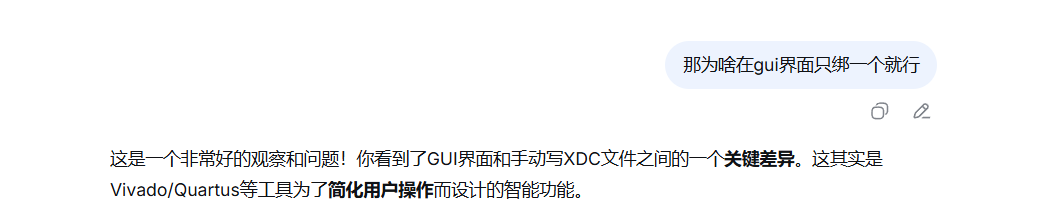 这是一个非常好的观察和问题!你看到了GUI界面和手动写XDC文件之间的一个**关键差异**。这其实是Vivado/Quartus等工具为了**简化用户操作**而设计的智能功能。
