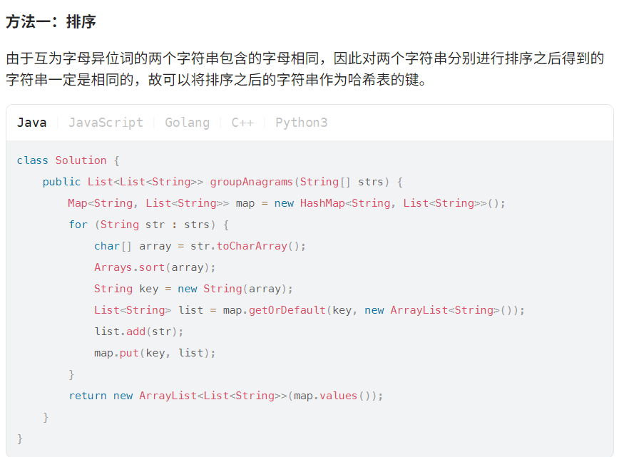 按照第一种共性我们就可以遍历每个字母异位词,先经过排序(作为key),然后将相同的key的字母异位词放入同一个集合即可