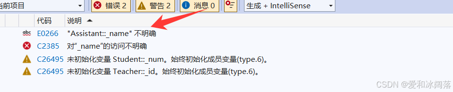 _name 是 Person 类的成员,当通过 Assistant 对象访问 _name 时(如 a._name),编译器无法确定应该访问哪条路径继承而来的 _name,因此我们可以确定是Person导致的二义性,在学生和老师中都保存了_name,产生了数据冗余