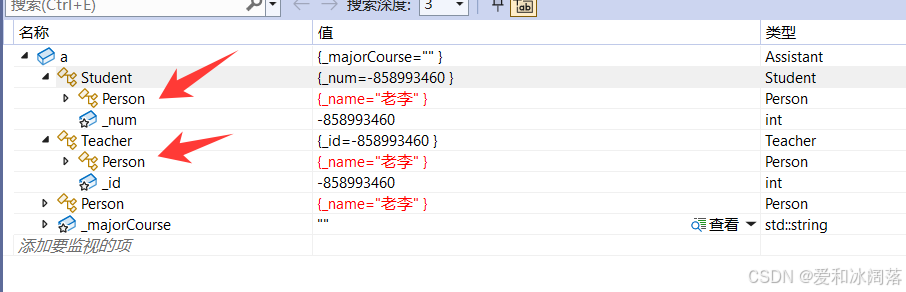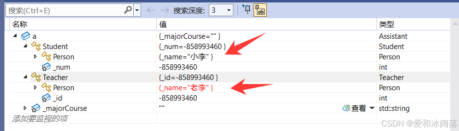 我们需要注意的是在assistant类中继承了学生(学生中有份person的信息),同时继承了老师(老师中也有份person的信息),意味着assistant中有了两份person的信息,这里就会导致数据冗余(数据浪费)和二义性(访问具有不确定性)