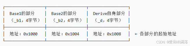 p2:p2 是指向 Base2 类型的指针,它只能 "看到" d 中属于 Base2 的部分(即 _b2)。由于 Base2 的部分在 d 中排在 Base1 之后,它的起始地址是 Base1 部分的地址加上 Base1 的大小(4 字节),也就是 0x1000 + 4 = 0x1004