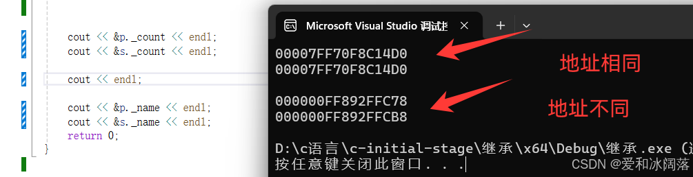 我们只需要打印Person对象和Student对象中_name的地址和_count地址便知道静态成员变量继承下来是同一个