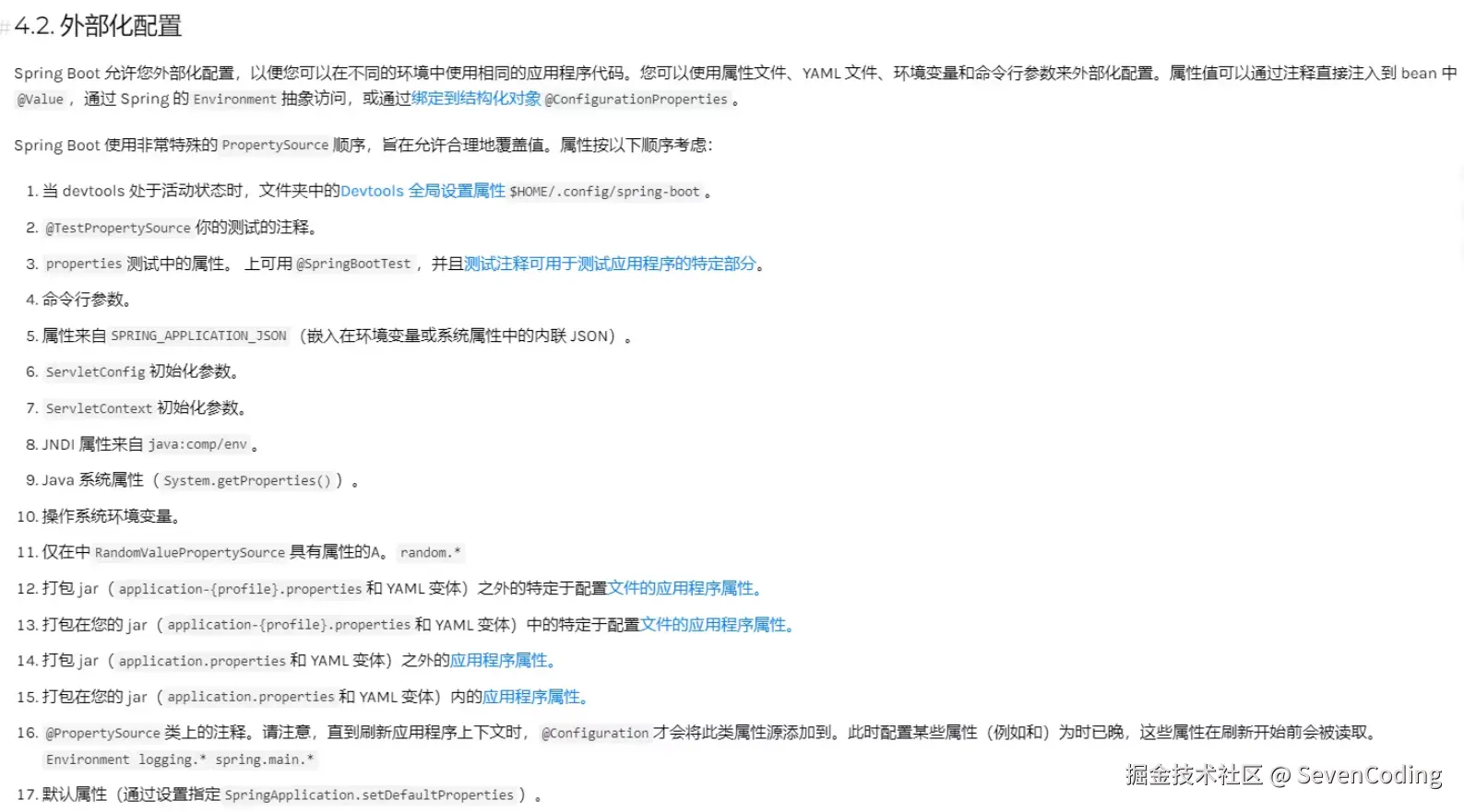 Spring Boot 在启动时加载配置属性的完整优先级顺序可参考如下的官方文档:从上到下,优先级逐渐降低,即下面的配置,同样的参数会被上面的配置所覆盖