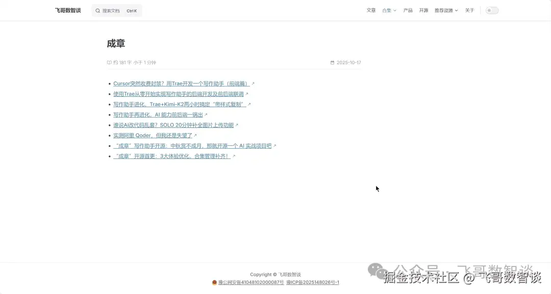 相关的文章,包括更新发布内容、使用技巧、实战等。 - 成章:主要记录我开源的 AI 写作助手"成章"的全部内容,包括发布前的几篇开发文章,以及后续的更新发布记录。