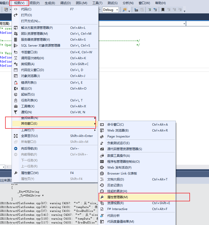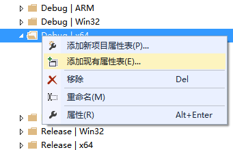 (1)在"属性管理器"中,右键点击其他项目的相应配置。例如Debug|X64。