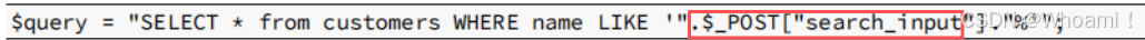 假设我们知道网页源代码 语句(为了更好的分析),先分析下已经预配置的SQL查询语句,其中上图的输入框就是用户输入的变量**.$_POST["search _input"]**,此处可进行SQL注入。