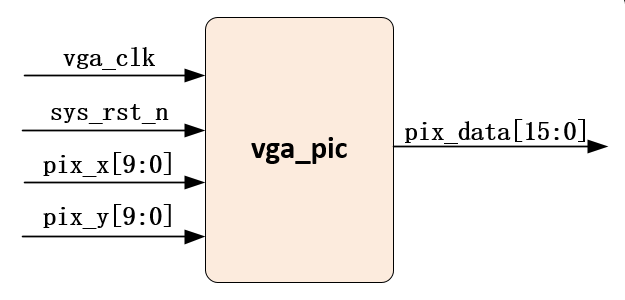 输入信号中,时钟信号vga_clk,频率为25MHz,为VGA显示器工作时钟,由分频模块产生并输入;复位信号sys_rst_n为顶层模块的rst_n信号输入,低电平有效;(pix_x,pix_y)为VGA有效显示区域像素点坐标,由VGA时序控制模块生并输入。