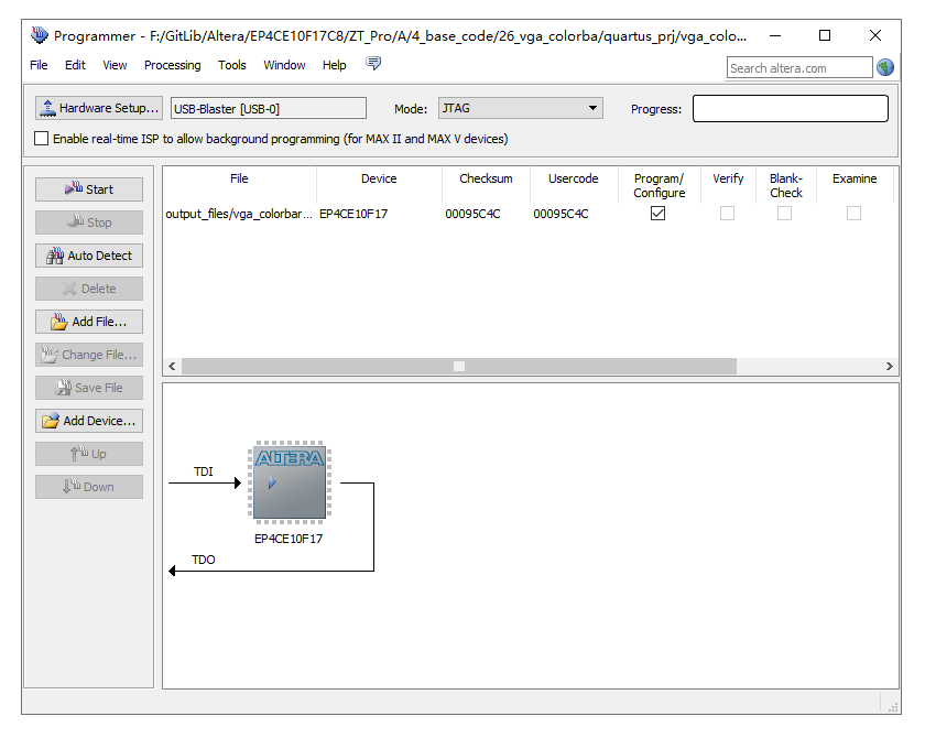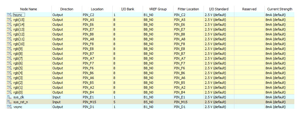 实验目标:编写VGA驱动,使用FPGA开发板驱动VGA显示器显示十色等宽彩条, VGA显示模式为640x480@60。