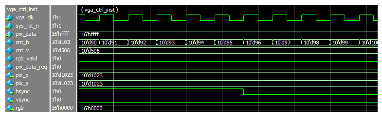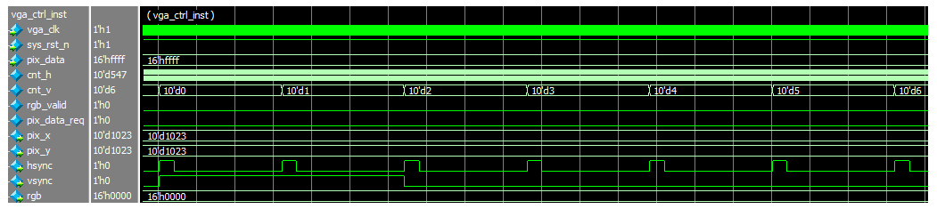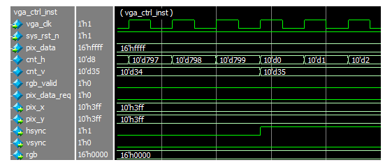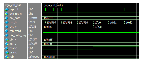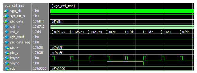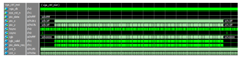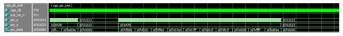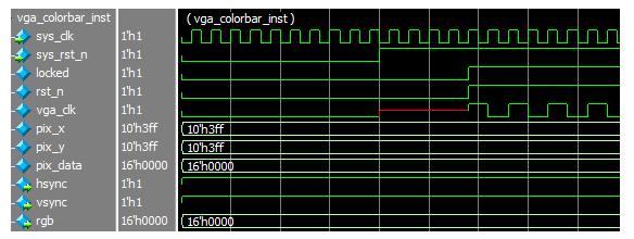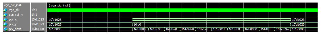 使用ModelSim软件对代码进行仿真,vga_ctrl模块已经通过赋值验证,clk_gen为调用IP核,无需仿真,在顶层模块的仿真波形分析,我们只查看rst_n信号和vga_pic模块的相关信号,仿真结果如下。