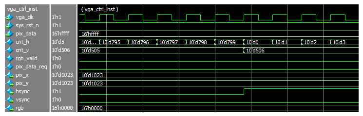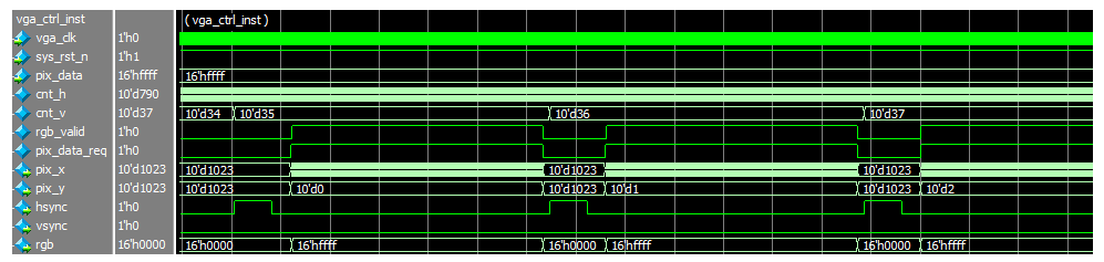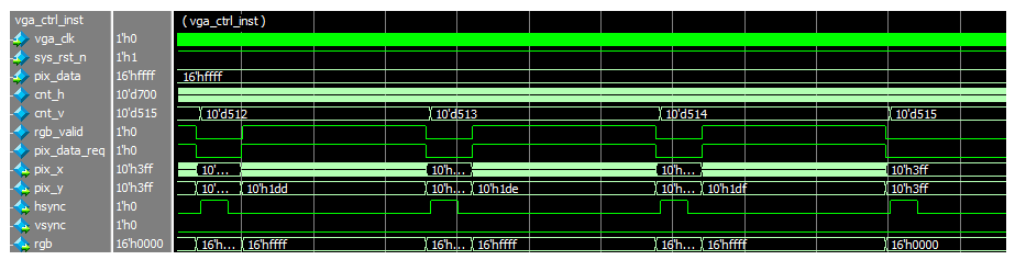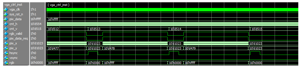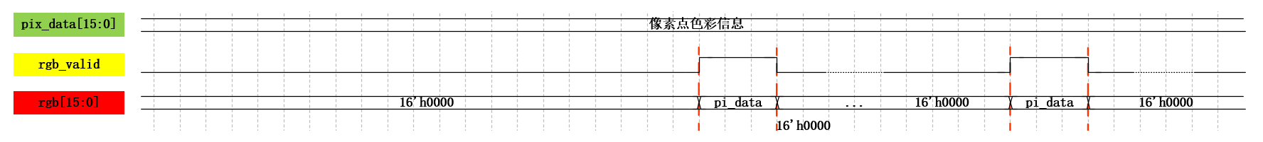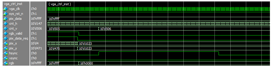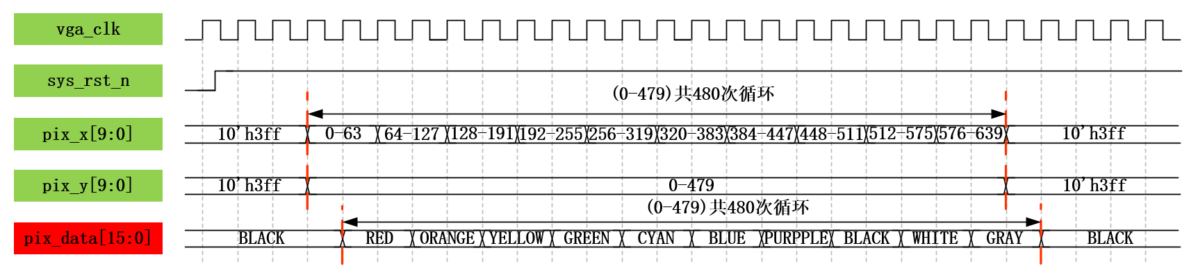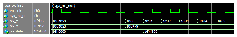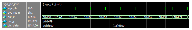 输出信号pix_data为彩条图像像素点色彩信息,在VGA有效显示区域像素点坐标(pix_x,pix_y)约束下生成,传输到VGA时序控制模块。