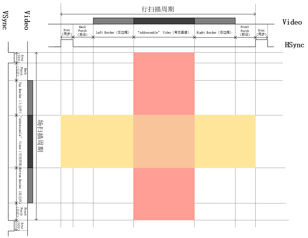 图中的红色区域表示在一个完整的行扫描周期中,Video图像信息只在此区域有效,黄色区域表示在一个完整的场扫描周期中,Video图像信息只在此区域有效,两者相交的橙色区域,就是VGA图像的最终显示区域。