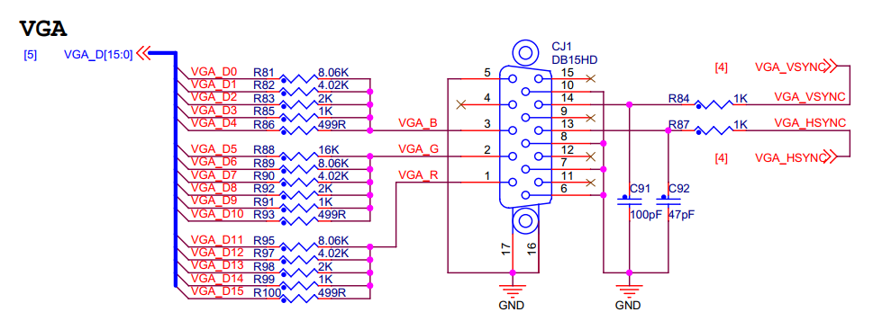 VGA_D[15:0]表示FPGA传入权电阻网络的数字图像信号,经过权电阻网络的数模转换,生成能够被VGA识别的模拟图像信号VGA_R、VGA_G、VGA_B。