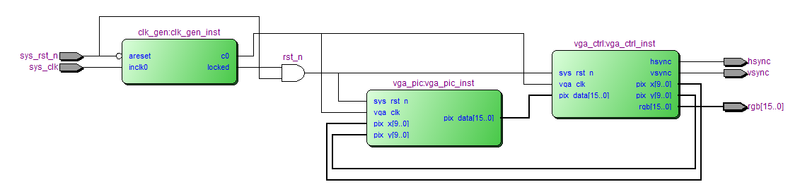 顶层模块参考代码理解起来较为简单,在此不再过多叙述。但有一点需要重点说明,由代码可知,vga_ctrl模块和vga_pic模块的复位信号是由信号rst_n信号作为输入,这是为何?