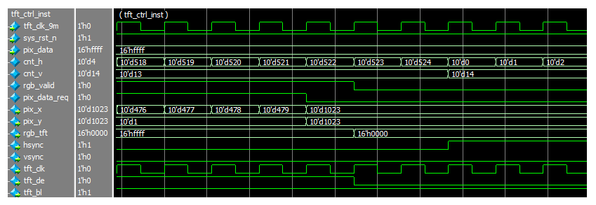 由图 36‑39、图 36‑40、图 36‑41、图 36‑42可知,pix_x信号在图像有效显示区域的完整计数周期被均分为十等份,pix_data在pix_x不同的计数范围内赋值不同的颜色信息。