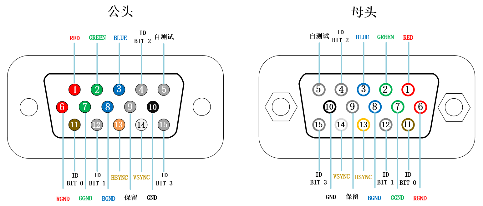 引脚5、9:这两个引脚分别是VGA接口的自测试和预留接口,不过不同生产厂家对这两个接口定义不同,在接线时,两引脚可悬空不接。