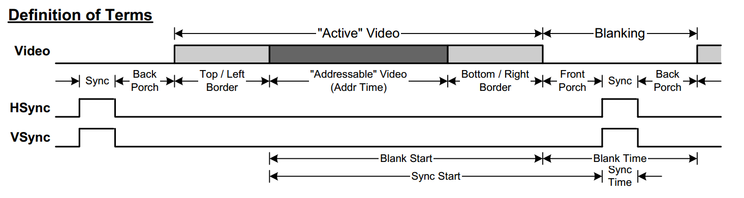 一个完整的行扫描周期,包含6部分:Sync(同步)、Back Porch(后沿)、Left Border(左边框)、"Addressable" Video(有效图像)、Right Border(右边框)、Front Porch(前沿),这6部分的基本单位是pixel(像素),即一个像素时钟周期。