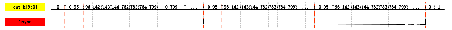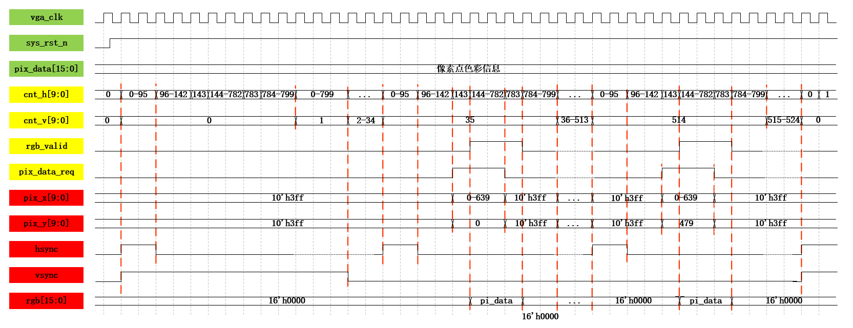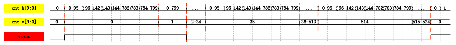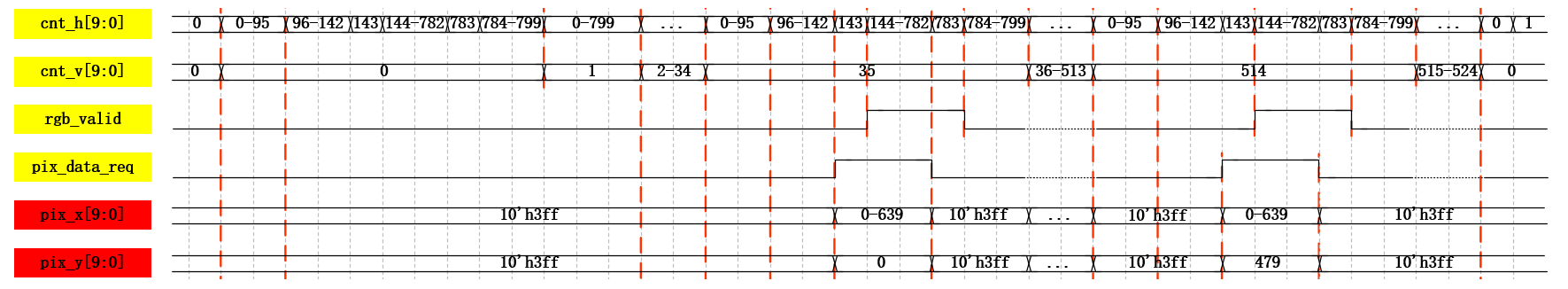 场同步信号时序与其类似,只是单位不再是像素时钟周期,而是一个完整的行扫描周期,在此不再赘述。