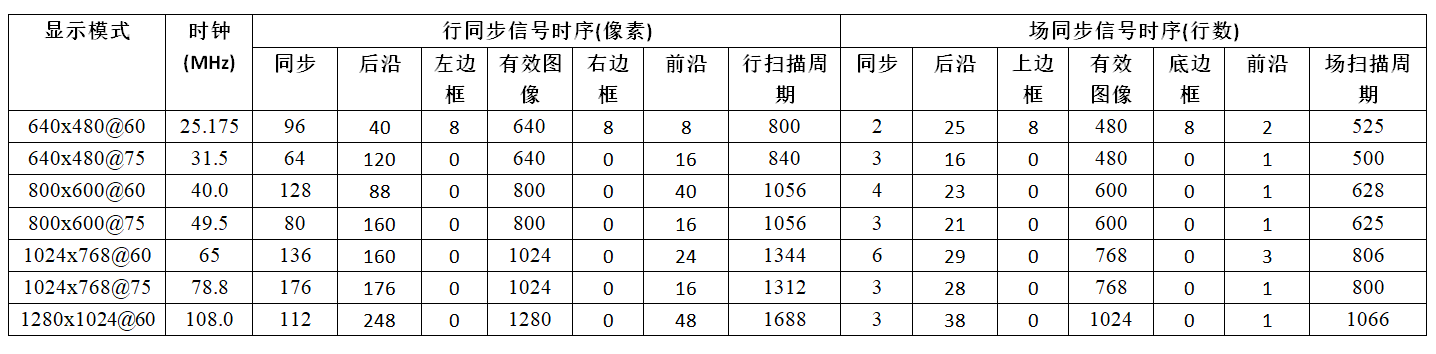 以上就是对VGA显示标准中分辨率相关参数的讲解,在编写VGA驱动时,我们要根据VGA显示模式的不同调整相关参数,只有这样VGA图像才能正常显示。