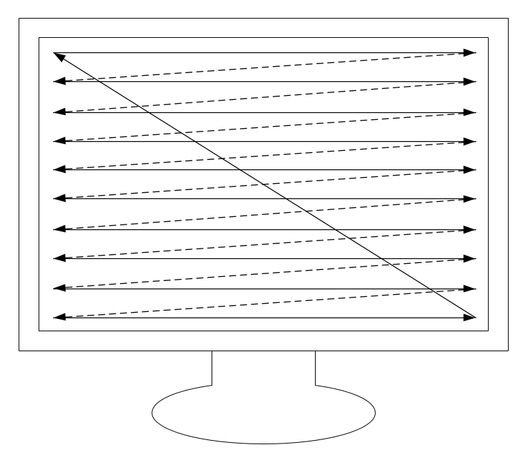 重复若干次扫描至最后一行行尾,一帧图像扫描完成,进行图像消隐,扫描坐标跳转回到左上角第一行行首(图中对角线箭头),开始下一帧图像的扫描。