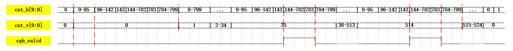 由图 36‑23、图 36‑24、图 36‑25可知,行扫描周期计数器cnt_h在计数范围0-799循环计数,计数周期为像素时钟周期;场扫描周期计数器在计数范围0-524循环计数,计数周期为完整的行扫描周期。