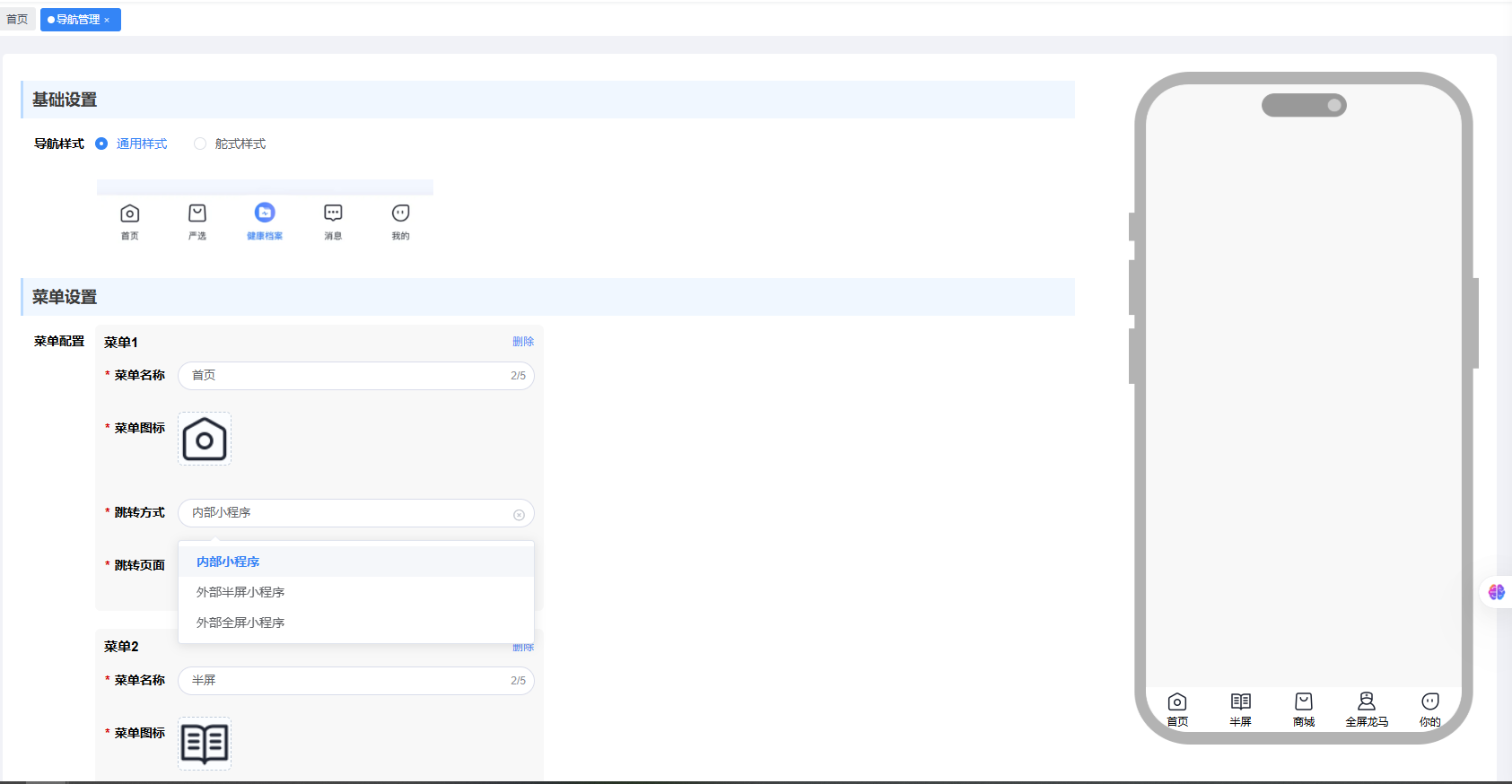 需求背景,在管理后台开放用户可以自定义配置小程序的导航路径,跳转的方式包含(跳转内部页面,半屏小程序,其他小程序),tabbar页面,二级页面