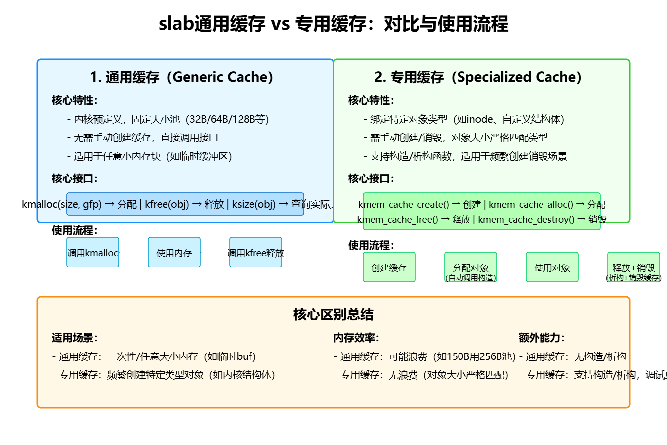 根据缓存的用途,slab分配器将缓存分为两类:通用缓存(Generic Cache)和专用缓存(Specialized Cache)。二者的核心区别在于"是否绑定特定对象类型",下面分别讲解其设计场景与使用方式。