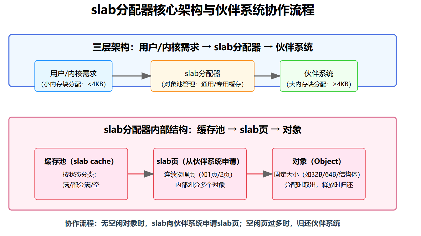 slab分配器并非独立工作,而是基于伙伴系统实现"大内存块"的申请与释放,二者协作流程如下: